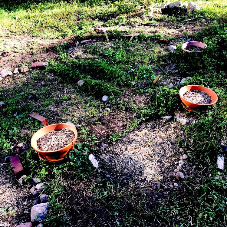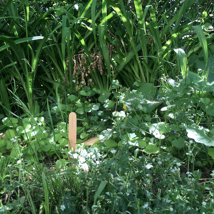 “I flattened that with rain and added a new mound over here instead. The seeds you planted in a row: no, I clumped them together. See, here’s the sprout clump. And you’ll notice this bed looks completely different today, because the surprise weeds are doing great. Also, here’s a dead mouse. I’m honestly not sure what happened there.”